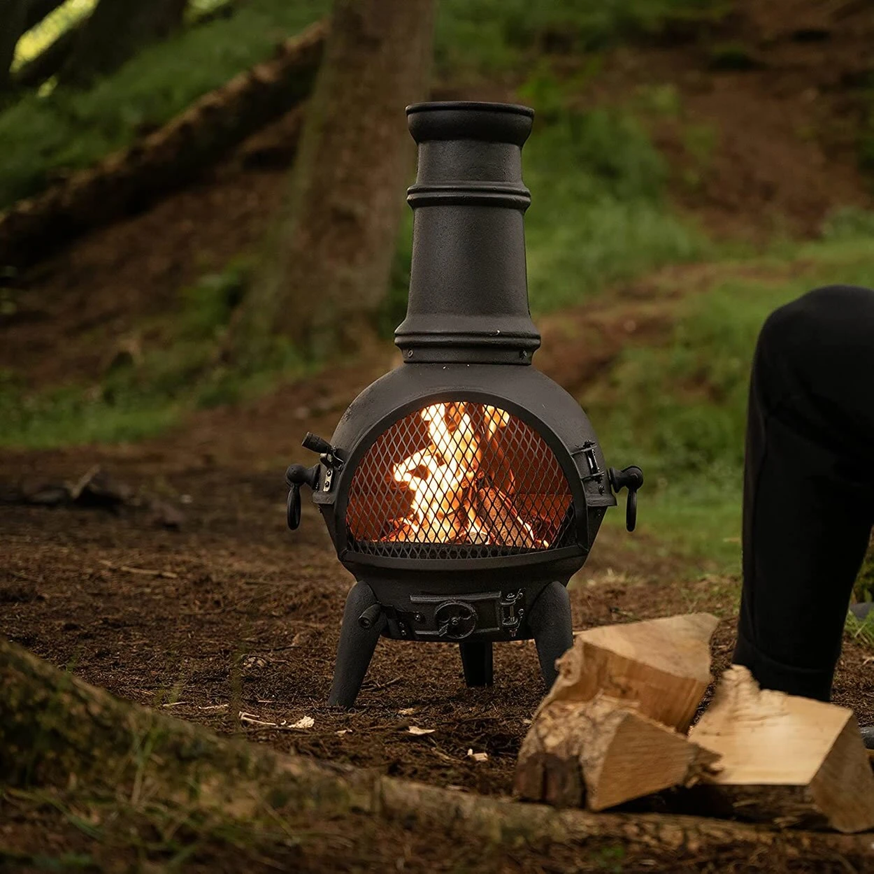 Medium sized steel chimenea with central open mesh body and cast iron legs to allow for greater airflow and brighter flame. Strong Frame and resilient to weather conditions. Lifting access hatch easy to open and close to add fuel.