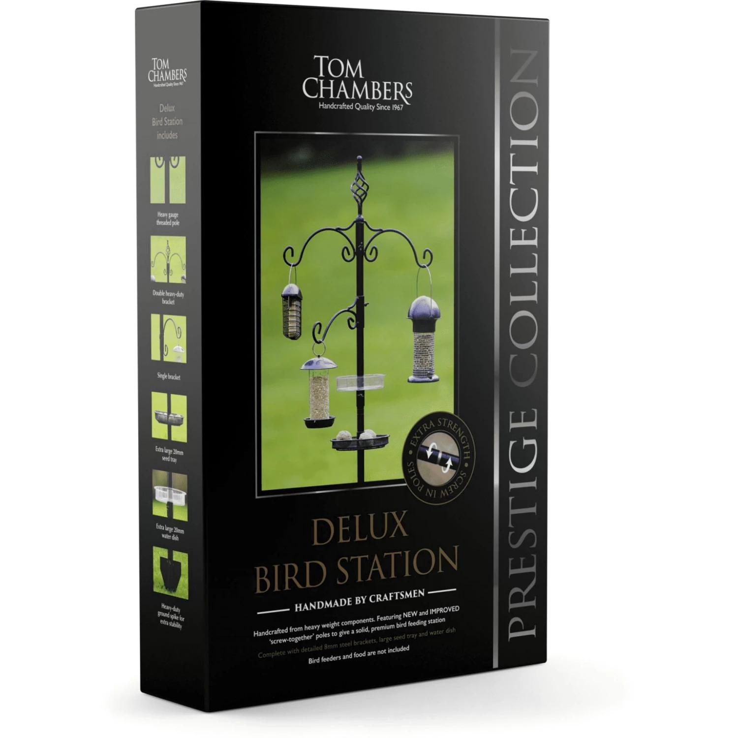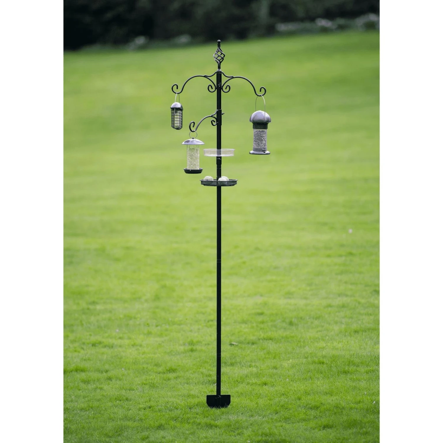 This bird feeding station is ideal for any garden. It is constructed from high quality materials with a heavy duty pole. The station has a decorative finial and two double hanging brackets, with an addition bracket lower down. In addition to this it also comes with a seed tray and water dish.