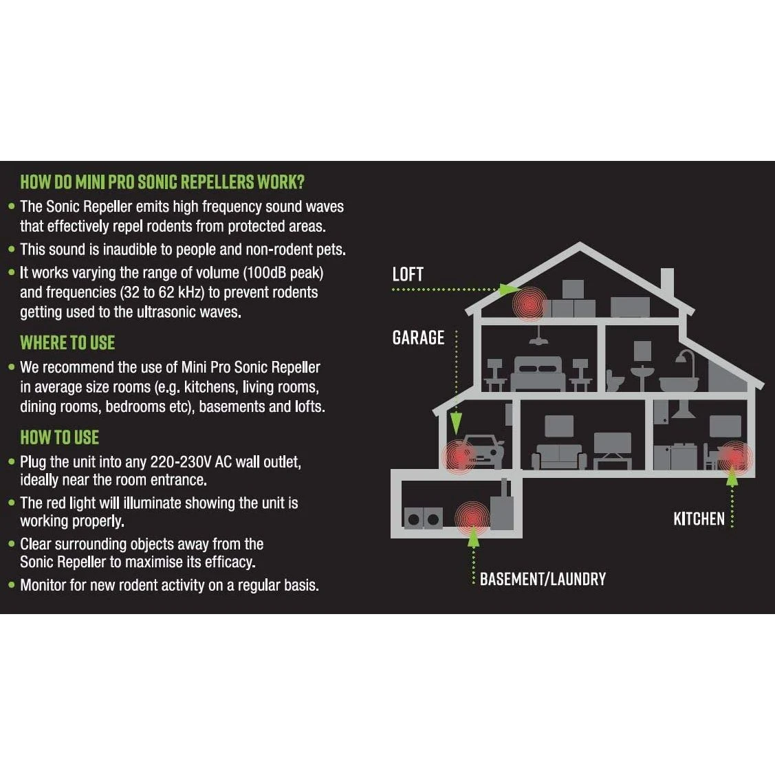 - Sonic Repellers plug in are ideal devices for use in average size areas such as garages, basements, attics and other rooms